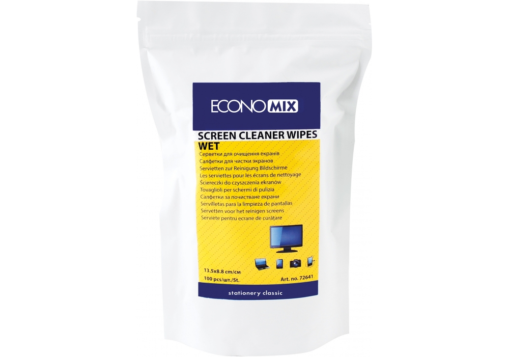 Серветки вологі TM Economix для очищення ТВ екранів, дисплеїв, мобільних телефонів, фотоапаратури, дзеркал, лінз та інших скляних поверхонь. Легко видаляють пил, відбитки пальців та інші забруднення. Антибактеріальні, не містять спирту, без неприємного запаху. Матеріал: серветка - неткане полотно на основі віскози та поліефірів. Виготовлено в Україні.