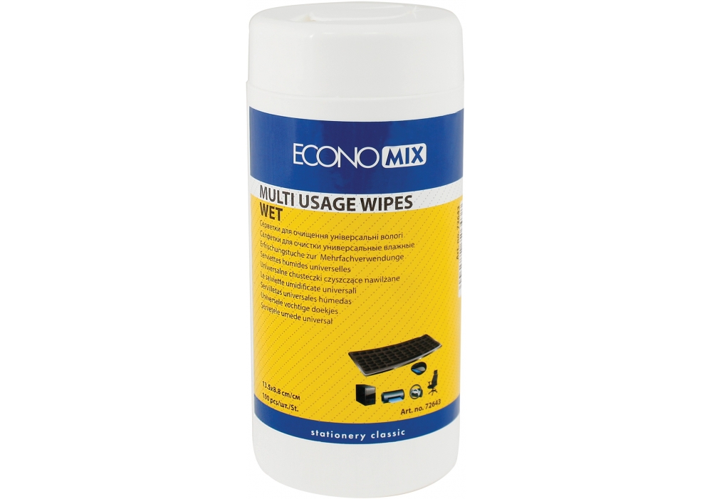 Серветки вологі TM Economix для очищення та догляду за оргтехнікою, меблями, пластиковими, шкіряними та металевими поверхнями. Легко видаляють пил, відбитки пальців та інші забруднення. Антибактеріальні, не містять спирту, без неприємного запаху. Матеріал: серветка - неткане полотно на основі віскози та поліефірів. Виготовлено в Україні.
