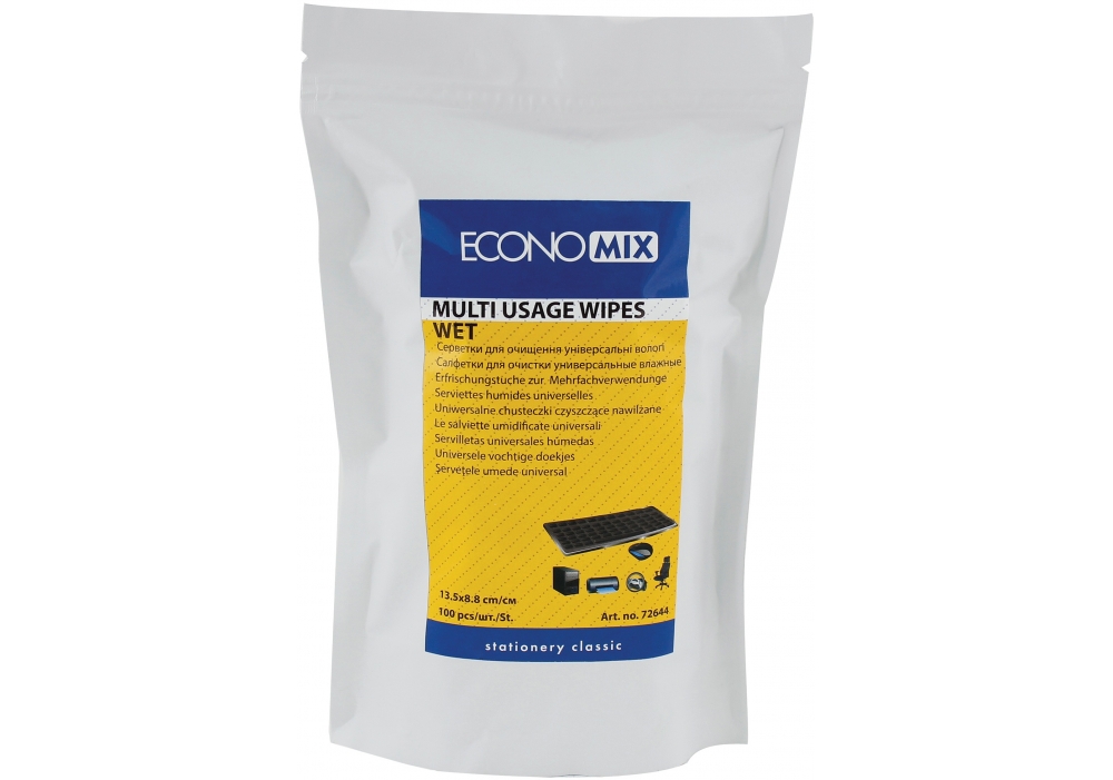 Серветки вологі TM Economix для очищення та догляду за оргтехнікою, меблями, пластиковими, шкіряними та металевими поверхнями. Легко видаляють пил, відбитки пальців та інші забруднення. Антибактеріальні, не містять спирту, без неприємного запаху. Матеріал: серветка - неткане полотно на основі віскози та поліефірів. Виготовлено в Україні.